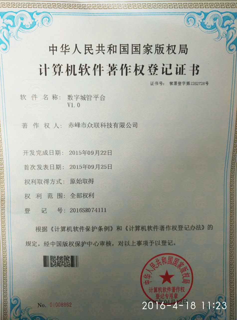 恭賀赤峰市眾聯(lián)科技有限公司通過(guò)大家的齊心協(xié)作,取得了“數(shù)字城管平臺(tái)”的軟件著作權(quán)!